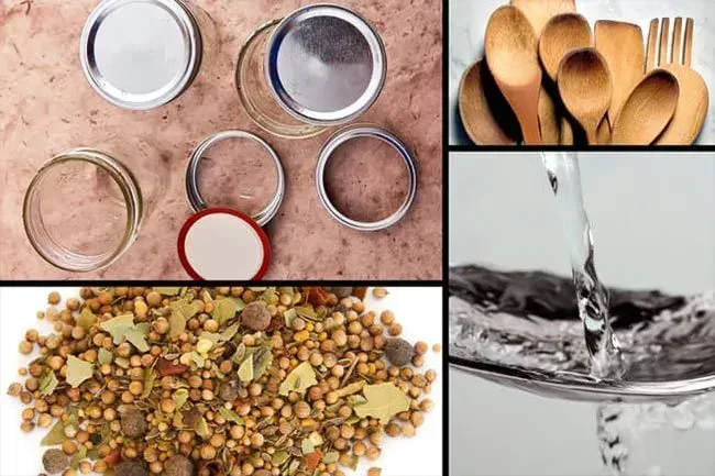 Für fermentierte Lebensmittel benötigen Sie Gläser mit Holz- oder Plastikutensilien (Metall kann mit dem Wahlprozess durcheinander bringen) und einem großen Behälter. Sie verwenden auch Wassersalzessig und Aromen Ihrer Wahl.