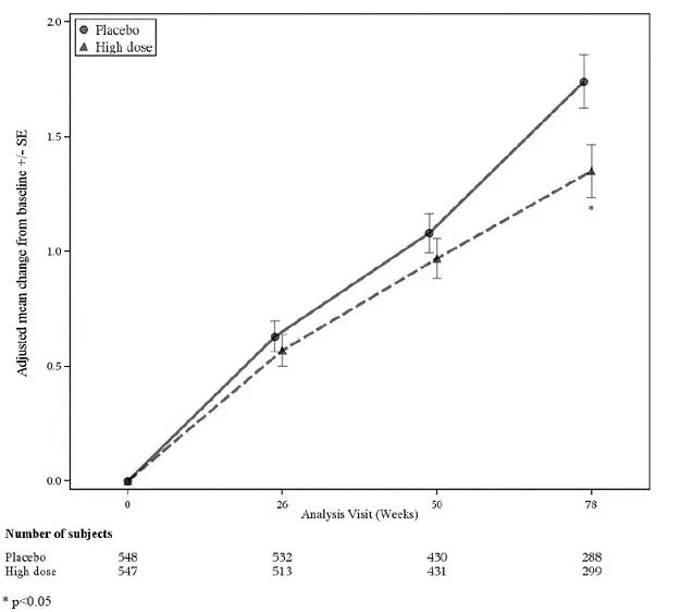 In Studie 2 1647 wurden die Patienten randomisiert 1: 1: 1, um eine hohe Dosis oder Placebo mit niedriger Dosis mit niedriger Dosis zu erhalten. Zu Studienbeginn betrug das Durchschnittsalter der Patienten 71 Jahre mit einer Reichweite von 50 bis 85 Jahren.