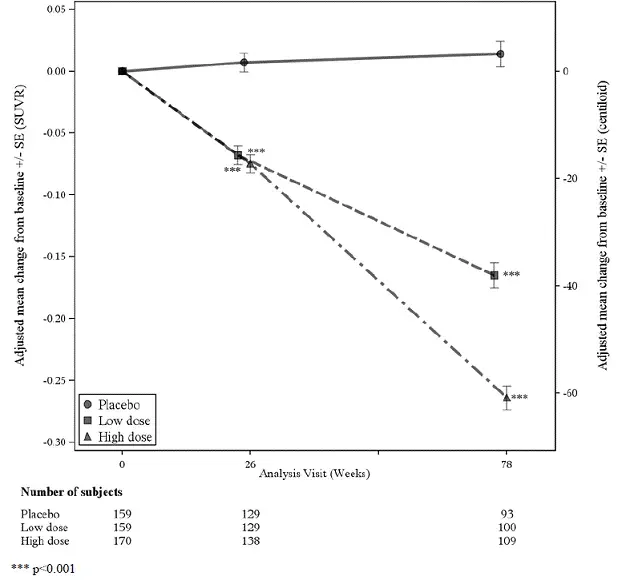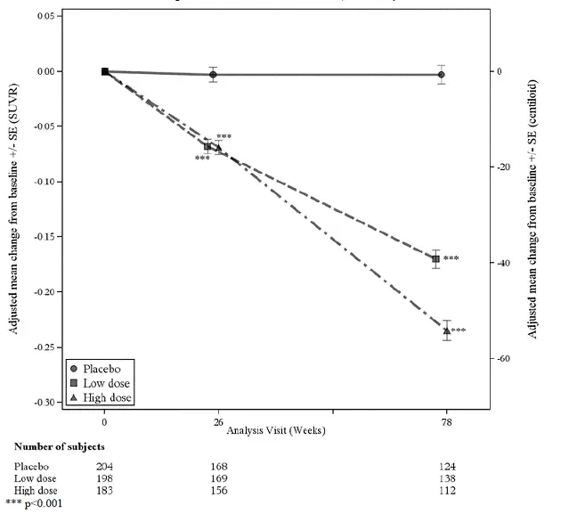 Eine Untergruppe von 585 Patienten wurde in die Amyloid -PET -Untergruppe eingeschlossen; Von diesen wurden 374 in Woche 78 bewertet. Die Ergebnisse der Amyloid -Beta -PET -Substudie sind in Abbildung 3 und Tabelle 8 beschrieben. CSF- und Plasmakiomarker sind in Tabelle 8 beschrieben.