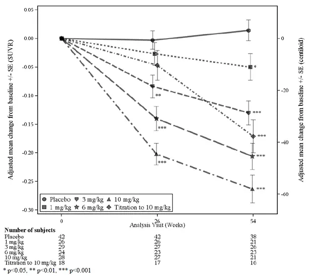 Die klinischen Bewertungen in Studie 3 waren explorativ. Die Ergebnisse für klinische Bewertungen wurden mit den Ergebnissen von Studie 1 in der CDR-SB- und MMSE-Werte nach 1 Jahr in der Gruppe mit Fixierdosis von 10 mg/kg in der Fixierdosis-Gruppe von 10 mg/kg richtig ausgerichtet als bei Patienten vor Placebo (CDR-SB: -1,26 95% CI [-2,356-0,163];