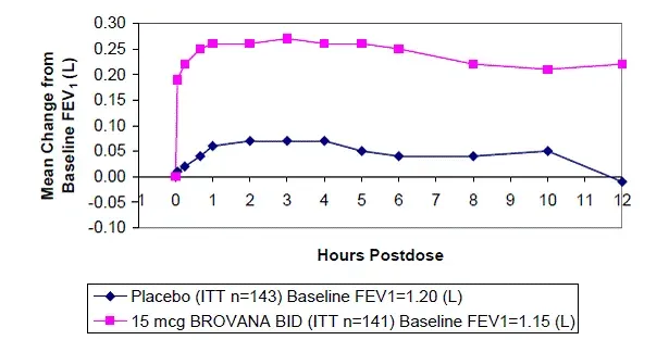 Brovana Inhalationslösung 15 MCG zweimal täglich significantly improved bronchodilation compared to placebo over the 12 hours after dosing (FEV 1 AUC0-12H). Diese Verbesserung wurde über den 12-wöchigen Studienzeitraum beibehalten.