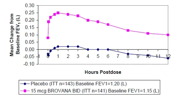 In beiden 12-wöchigen Studien führte Brovana-Inhalationslösung 15 mcg zweimal täglich zu einer statistisch signifikanten Änderung von ca. 11% bei mittlerer FEV 1 (gemäß den prozentualen Veränderungen gegenüber der Studienbasis -Basis -FEV 1 Am Ende des Dosierungsintervalls über die 12 Wochen der Behandlung der primäre Wirksamkeitsendpunkt im Vergleich zu Placebo. Im Vergleich zur Brovana -Inhalationslösung 15 MCG zweimal täglich täglich brovana Inhalationslösung 25 MCG zweimal täglich und 50 mcg einmal täglich bieten eine Vielzahl von Endpunkten, einschließlich FEV, keinen ausreichenden zusätzlichen Nutzen 1 die Verwendung höherer Dosen zu unterstützen. Diagramme der mittleren Änderung der FEV 1 Werte, die über die 12 Stunden nach der Dosierung für die Brovana -Inhalationslösung 15 MCG zweimal täglich dosis und für die Placebo -Gruppe erhalten wurden, sind in den Abbildungen 1 und 2 für die klinische Studie nach unten bereitgestellt. Die Diagramme umfassen den mittleren Fev 1 Veränderung beobachtet nach der ersten Dosis und nach 12 Wochen der Behandlung. Die Ergebnisse der klinischen Studie B waren ähnlich.