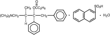 Propoxyphen -Napsylat USP ist ein geruchloses weißes kristallines Pulver mit einem bitteren Geschmack. Es ist sehr leicht löslich in Wasser und löslich in Methanolethanolchloroform und Aceton. Chemisch ist es (α S 1 R ) -α- [2- (Dimethylamino) -1-methylethyl] -α-Phenylphenethylpropionatverbindung mit 2-Naphthalenesulfonsäure (1: 1) -Monohydrat, das durch die begleitende strukturelle Formel dargestellt werden kann. Sein Molekulargewicht beträgt 565,72.