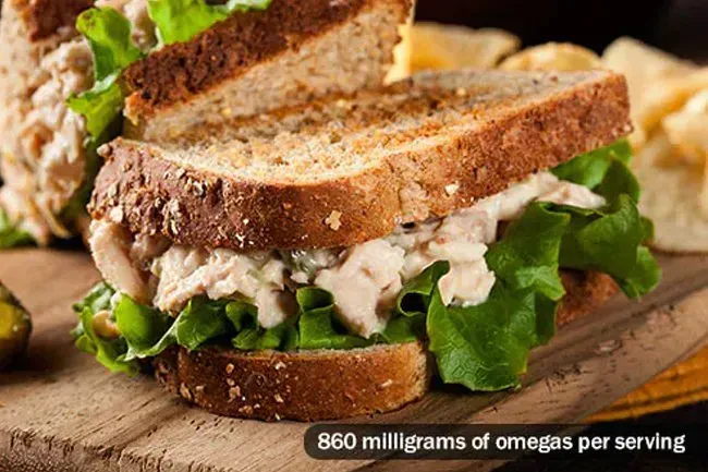 Ziehen Sie 1-2 Mal pro Woche fettiger Fisch zu essen. Eine Portion ist je nach Gewicht etwa 3,5 Unzen gekocht. Thunfisch in Dosen in einem Sandwich oder Salat ist eine schnelle Lösung für nicht viel Geld. Albacore hat ungefähr dreimal so viel Omegas wie Skipjack oder helles Zeug. Mit frischem Thunfisch ist der Bauch fettiger als das Fleisch zu beiden Seiten.