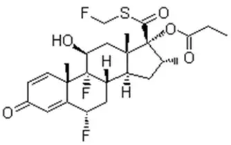 Der Wirkstoff von Fluticason Propionat ist ein weißes Pulver mit einem Schmelzpunkt von 273 ° C und einem Molekulargewicht von 500,6 und die empirische Formel ist c 25 H 31 F 3 O 5 S. Es ist praktisch in Wasser in Wasser in Dimethylsulfoxid und Dimethylformamid frei und leicht löslich und in Methanol und 95% Ethanol leicht löslich. Fluticasonpropionat ist ein synthetisches Kortikosteroid mit dem chemischen Namen S- (Fluormethyl) -6α9-DiFluoro-11β-17-Dihydroxy-16α-methyl-3-oxoandrosta-14-dien-17β-Kohlen-Kohlen-Kohlenhydrat 17-Propionat und der folgenden chemischen Struktur: