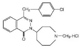 Azelastinhydrochlorid Wirkstoff tritt als weißer, geruchloser kristalline Pulver mit einem bitteren Geschmack auf. Es hat ein Molekulargewicht von 418,37. Es ist sparsam löslich in Wassermethanol und Propylenglykol und in Ethanol -Octanol und Glycerin leicht löslich. Es hat einen Schmelzpunkt von 225 ° C und den pH -Wert von 5,2. Sein chemischer Name ist (±) -1- (2H) -Phthalazinon4-[(4-Chlorphenyl) methyl] -2- (Hexahydro-1-methyl-1H-Azepin-4-yl)-Monohydrochlorid. Seine molekulare Formel ist c 22 H 24 Cln 3 O.HCl mit der folgenden chemischen Struktur: