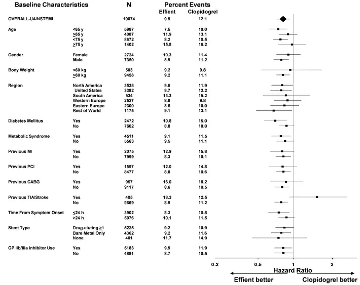 Es wurde gezeigt, dass Effient die Rate eines kombinierten Endpunkts des nicht tödlichen Myokardinfarkts (MI) oder des nicht tödlichen Schlaganfalls im Vergleich zu Clopidogrel verringert. Der Unterschied zwischen den Behandlungen wurde vorwiegend von MI ohne Unterschied zu Schlaganfällen und geringem Unterschied zum CV -Tod angetrieben [siehe Klinische Studien ].