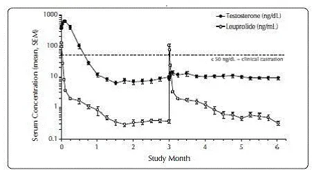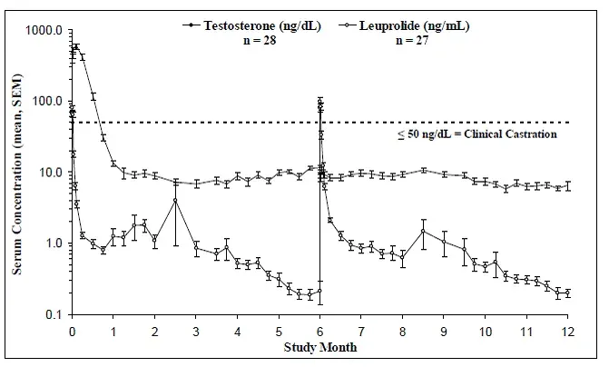 Eine multizentrische Open-Label-Studie wurde mit jedem Teilnehmer durchgeführt ® Formulierung (NULL,5 mg 22,5 mg 30 mg und 45 mg) bei Patienten mit dem Juwett -Stadium A, aber Prostatakrebs, die mit mindestens einer einzigen Injektion des Studienmedikaments behandelt wurden (Tabelle 8). Die Wirksamkeitsergebnismaßnahme war die medizinische Kastrationsrate, die als Erreichung und Aufrechterhaltung der Serumtestosteronunterdrückung auf ≤ 50 ng/dl definiert wurde (Abbildungen 1-4).