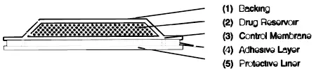 Das Estraderm (Estradiol Transdermal) System umfasst vier Schichten. Proceeding from the visible surface toward the surface attached to the skin these layers are (1) a transparent polyester/ethylene vinyl acetate copolymer film (2) a drug reservoir of estradiol USP and alcohol USP gelled with hydroxypropyl cellulose NF (3) an ethylene-vinyl acetate copolymer membrane and (4) an adhesive formulation of light mineral oil NF und Polyisobutylen. Ein Schutzauskleid (5) des silikonisierten Polyesterfilms ist an der Klebstoffoberfläche befestigt und muss entfernt werden, bevor das System verwendet werden kann.