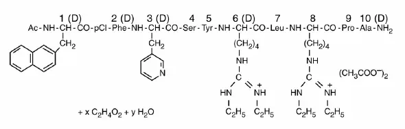 Die Ganirelix-Acetat-Injektion (Ganirelix) ist ein synthetisches Dekapeptid mit hoher antagonistischer Aktivität gegen natürlich vorkommende Gonadotropin-freisetzende Hormon (GNRH). Ganirelix-Acetat wird von nativem GnRH mit Substitutionen von Aminosäuren an den Positionen 1 2 3 6 8 und 10 abgeleitet, um die folgende molekulare Formel des Peptids zu bilden: N-Acetyl-3- (2-napthyl) -d-alanyl-chl-dphenylalanyl-3- (3-pyridyl) -D-alanyl-alanyl-l-l-l-l-l-l-l-l-l-l-l-l-l-l-l-l-l-l-l-l-l-l-l-l-l-l-l-l-l-l-l-l-l-l-l-l-l-l-l-l-3- (3-pyridy 9 N 10 -Diethyl-d-homoarginyl-l-l-leucyln 9 N 10 -Diethyl-l-homoarginyl-l-prolyl-d-alanylamidacetat. Das Molekulargewicht für Ganirelix -Acetat beträgt 1570,4 als wasserfreie freie Basis. Die strukturelle Formel lautet wie folgt: