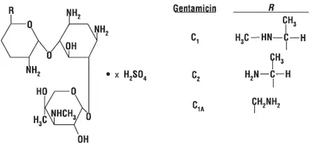 Gentamicin wird aus Kulturen von erhalten Micromonospora purpurea . Es ist eine Mischung der Sulfatsalze von Gentamicin C. 1 C 2 und c 1a . Alle drei Komponenten scheinen ähnliche antimikrobielle Aktivitäten zu haben. Gentamicinsulfat tritt als weißes zu Buffpulver auf und ist löslich in Wasser und unlöslich in Alkohol. Die strukturelle Formel lautet wie folgt: