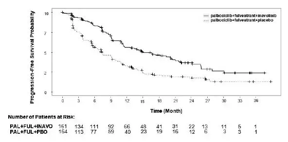 Die Patienten erhielten entweder Inavolisib 9 mg (n = 161) oder Placebo (n = 164) einmal täglich oral in Kombination mit Ibrance 125 mg oral einmal täglich für 21 aufeinanderfolgende Tage, gefolgt von 7 Tagen freie Behandlung, um einen Zyklus von 28 Tagen von 28 Tagen zu umfassen, und fuvestrant 500 mg intramuskulär am Zyklus 1 und 15 und dann am Tag 1 von Tag 1, 1 von Tag 1, 1 von Tag 1, 1 von Tag 1, 1 von Tag 1, 1 von Tag 1, 1 von Tag 1 und 1 von Tag 1, 1 von Tag 1, 1 von Tag 1 und Tag 1 von 28 Tagen. Die Patienten erhielten eine Behandlung bis zur Krankheitsprogression oder in nicht akzeptabler Toxizität. Darüber hinaus erhielten alle Frauen und Männer vor/perimenopausaler und Männer während der gesamten Therapie einen LHRH -Agonisten.