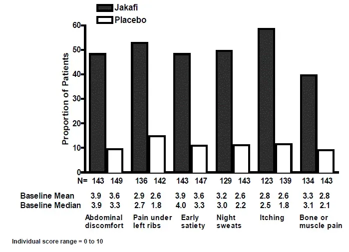 3 zeigt den Anteil der Patienten mit mindestens 50% Verbesserung der einzelnen Symptome, die den Gesamtsymptom -Score umfassen, was darauf hinweist, dass alle 6 der Symptome zur Ansprechrate der Gesamt -Symptom -Score in der mit Jakafi behandelten Gruppe beigetragen haben.