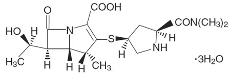 teilnehmen ® IV (Meropenem für die Injektion) ist ein steriles pyrogenfreies synthetisches Carbapenem-Antibakteriell für die intravenöse Verabreichung. Es ist (4R5S6S) -3-[[(3S5s) -5- (Dimethylcarbamoyl) -3-Pyrrolidinyl] -6-[(1R) -1-hydroxyethyl] -4methyl-7-oxo-1-Azabicyclo [3.2.0] hept-2-2-carbaticalicsack-Trihyklat. Seine empirische Formel ist c 17 H 25 N 3 O 5 S • 3H 2 O mit einem Molekulargewicht von 437,52. Seine strukturelle Formel ist: