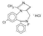 Midazolam ist eine weiße bis hellgelbe kristalline Verbindung, die in Wasser unlöslich ist. Das gebildete Hydrochloridsalz von Midazolam vor Ort ist löslich in wässrigen Lösungen. Chemisch Midazolam HCl ist 8-Chlor-6- (2-Fluorphenyl) -1-methyl-4 H - Imidazo [15-A] [14] Benzodiazepinhydrochlorid. Midazolamhydrochlorid hat die molekulare Formel C. 18 H 13 Clfn 3 • HCl A berechnetes Molekulargewicht von 362,25 und die folgende Strukturformel: