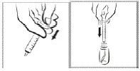 - Die Spritze in eine Glas- oder Plastikbecher entleeren, die mindestens 2 Unzen (1/4 Tasse 60 ml) Wasser oder Orangensaft enthält, um 1 Minute kräftig umrühren und sofort trinken (Abbildung 7).