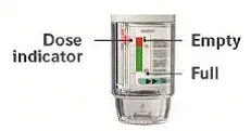 - Der Dosisindikator zeigt ungefähr, wie viele Puffs im Inhalator übrig bleiben.