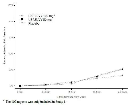 In beiden Studien war der Prozentsatz der Patienten, die Kopfschmerzfreiheit und MBS-Freiheit erreichten, 2 Stunden nach der Dosierung signifikant größer bei Patienten, die Ubrelvy erhielten als bei Patienten, die Placebo erhielten (siehe Tabelle 3). Tabelle 3 zeigt auch die Ergebnisse der Analysen des Prozentsatzes der Patienten, die nach 2 Stunden Schmerzlinderung erzielen (definiert als Verringerung der Migräneschmerzen von mittelschwer oder schwerer bis mild oder gar nicht) nach der Dosis und des Prozentsatzes der Patienten, die zwischen 2 und 24 Stunden nach der Dosierung anhaltende Schmerzfreiheit erreichen.
